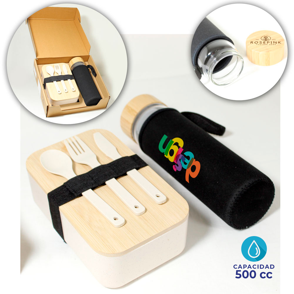 SET LONCHERA, INCLUYE CONTENEDOR + CUBIERTOS PP + BOTELLA DE AGUA 500 ML TAPA BAMBOO + FUNDA NEOPRENO EN COLOR NEGRO. 31*27,5*7,5 CM APROX.